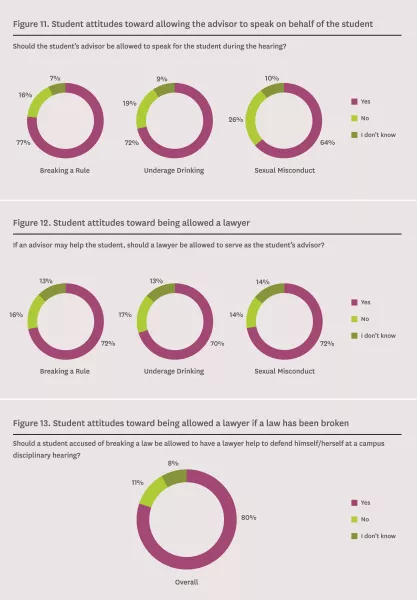 A majority of students think that a student who is accused of breaking a campus rule (88 percent), engaging in underage drinking (84 percent), or engaging in sexual misconduct (77 percent) should be allowed to have an advisor help to defend the student at the campus disciplinary hearing (Figure 10).