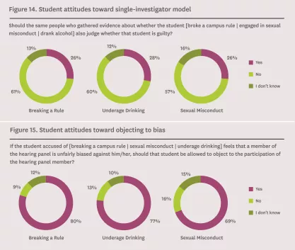 A majority of students do not think that the same people who gathered evidence about whether a student broke a campus rule (61 percent), engaged in underage drinking (60 percent), or engaged in sexual misconduct (57 percent) should also judge whether that student is guilty of the alleged misconduct (Figure 14).