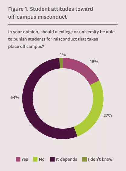 As shown in Figure 1, students have mixed attitudes toward whether the jurisdiction of a college or university should extend to off-campus conduct: 18 percent of students think a college or university should be able to punish students for off-campus misconduct; 27 percent of students do not think a college or university should be able to punish students for off-campus misconduct; and 54 percent of students think it depends on the circumstances.