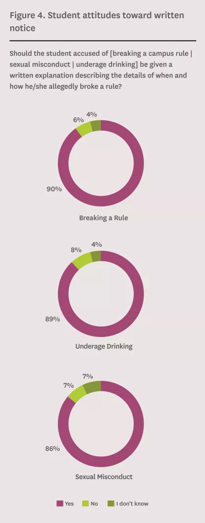 A majority of student respondents think a student who is accused of breaking a campus rule (90 percent), engaging in underage drinking (89 percent), or engaging in sexual misconduct (86 percent) should be given a written explanation of when and how the student allegedly broke the campus rule, engaged in underage drinking, or engaged in sexual misconduct, respectively (Figure 4).