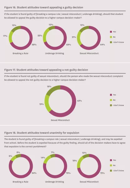 A majority of student respondents think that if a student is found guilty of breaking a campus rule (68 percent), engaging in underage drinking (69 percent), or engaging in sexual misconduct (64 percent), the student should be allowed to appeal the guilty decision to a higher campus decision-maker (Figure 16). FIRE argues that an accused student’s right to appeal a finding or sanction is a core component of any fair system of adjudication.[21]