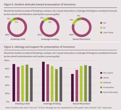When a student has allegedly broken a rule, 85 percent of female students think the student should be considered innocent by the school’s administration until the student is proven guilty. Fewer (77 percent) female students think a student who has allegedly engaged in sexual misconduct should be considered innocent until proven guilty.