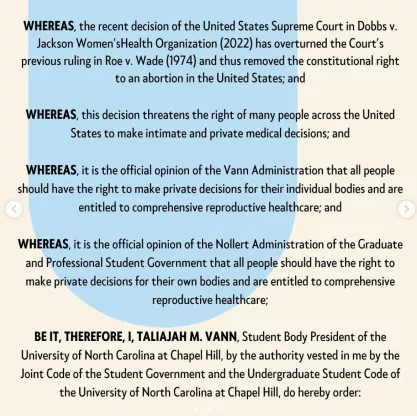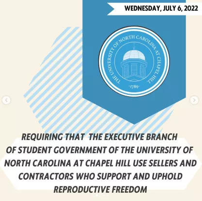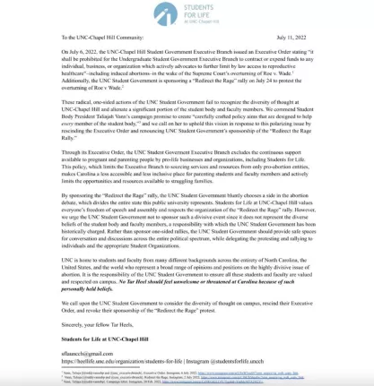 Home Research & Learn Contents Table of Contents University of North Carolina Student Government Executive Order, July 6, 2022 Related pages Case: University of North Carolina at Chapel Hill: Student Government Executive Branch Bans Funding to Pro-Life Student Groups School: University of North Carolina, Chapel Hill