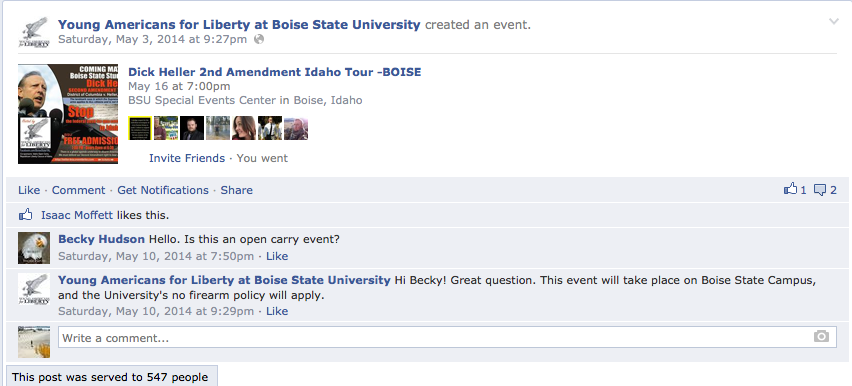 Home Research & Learn Contents Table of Contents YAL at Boise State's Statement on Open Carry at Event Related pages Case: Boise State University: Unconstitutional Security Fees for Gun Rights Activist's Speech School: Boise State University